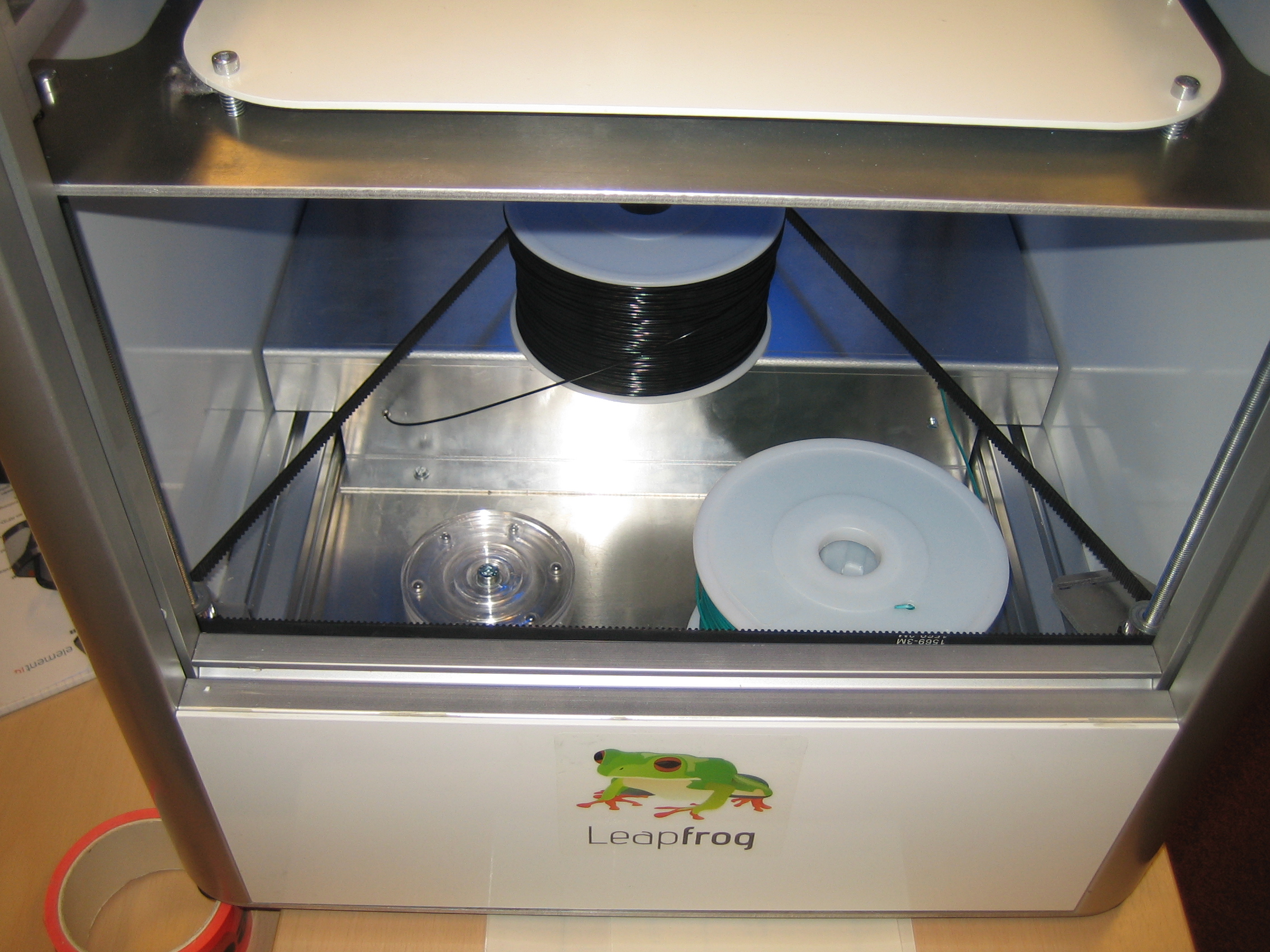 | In the bottom of the machine there is room for two spools. At the bottom left of the machine you see the turn-table where the spool normally sits. The spool with the black ABS is where you place it for feeding the filament into the feed tube. |