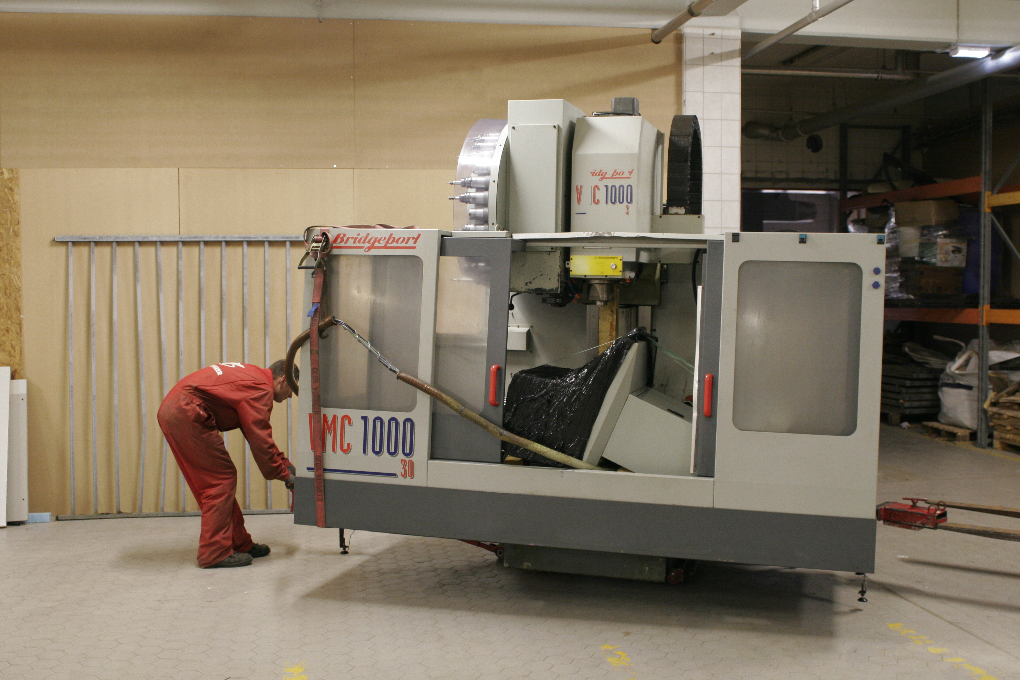 met een rubber duwblok op de lepels wordt de machine netjes op z'n plek gerold